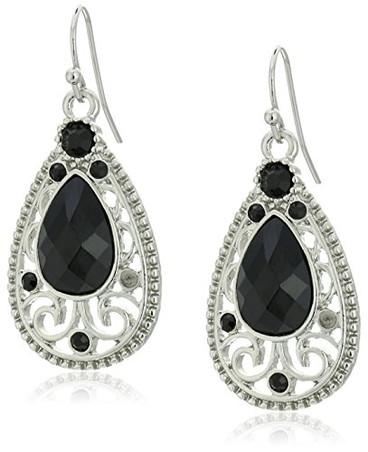 Silver-tone teardrop earrings featuring faceted black stones and vintage style filigree details