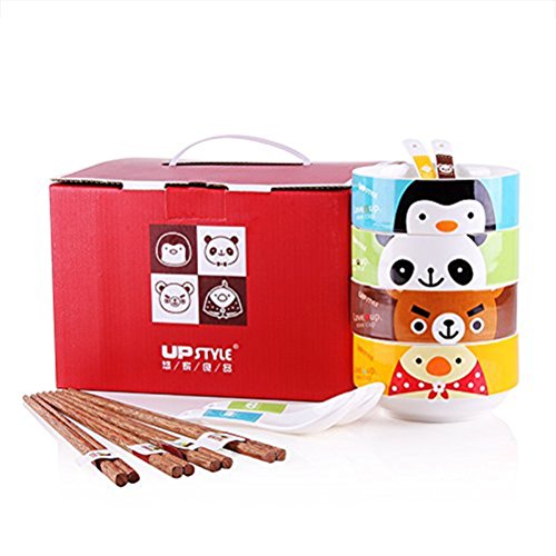 UPSTYLE Cute Cartoon Pattern Ceramic Bowls Cereal Rice Bowls Tableware Suit Dinnerware Set With 4 Bowls, 4 Spoons, 4 pairs of Chopsticks (4 bowls a set)
