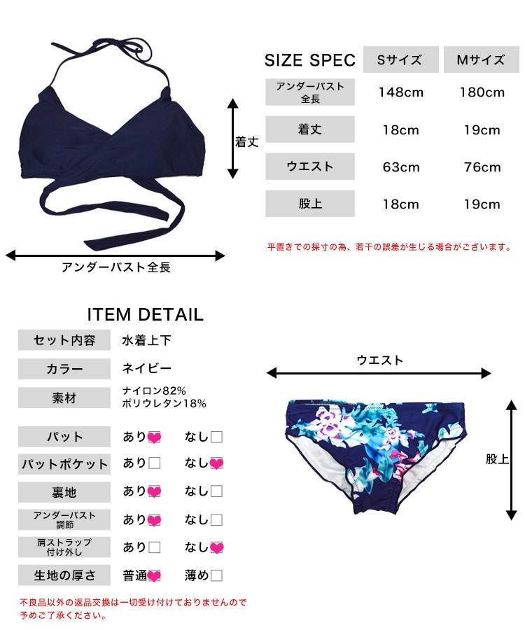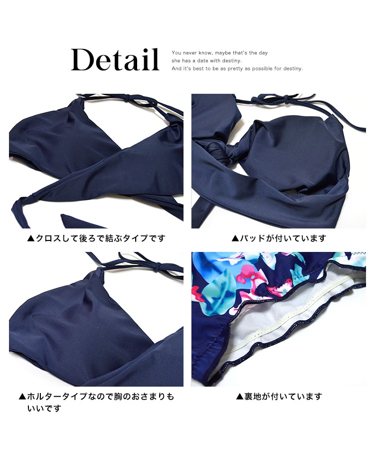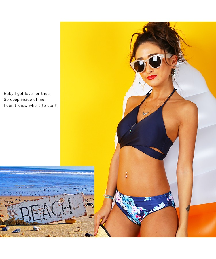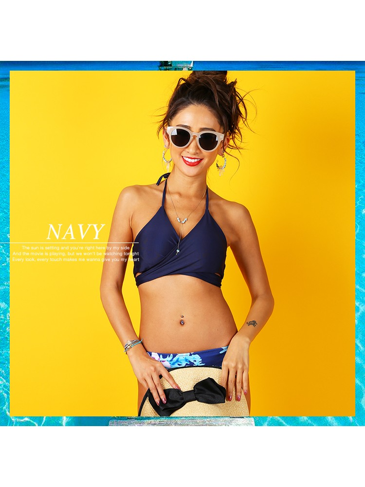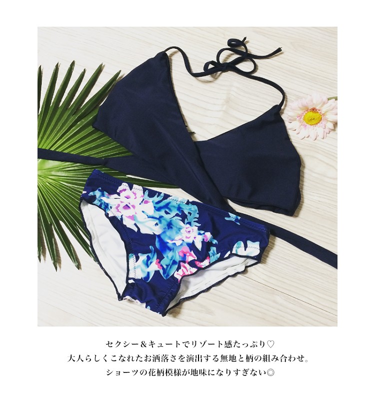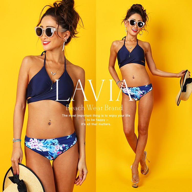 | 商品特徴 | LAVIA(ラヴィア)から新作のプチプラ水着が入荷しました。深みのあるネイビートップスと鮮やかなフラワーがプリントされたショーツとのセット水着!アンダーでクロスさせるトップスは脇からバストを中心に寄せれくれるので美しいボディラインを演出してくれ、太めの紐が安定した着用感があります。ピンク系の鮮やかなショーツは立体的なフラワープリントで色っぽく、大人な女性に魅せてくれます! 【特徴】 今年流行の体に巻きつけて着用するクロスバンドビキニ!しっかりとした太めのリボンが体のラインをきれいに見せ、胸元のクロス部分が女性らしい胸のラインを作ります。落ち着きのあるネイビーと華やかなフラワープリントは女性度を上げてくれること間違いなしです! |