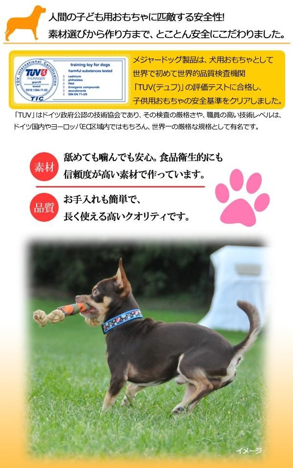 | 素材は耐久性が高く、ワンちゃんが噛んでも安心・安全なものを使用しています。ワンちゃんが長く楽しめるよう様々な工夫がなされているおもちゃです♪そのクオリティの高さは、ドッグトレーナーも愛用している程です! |