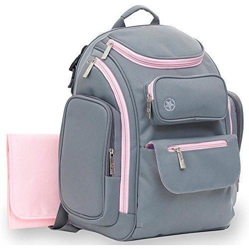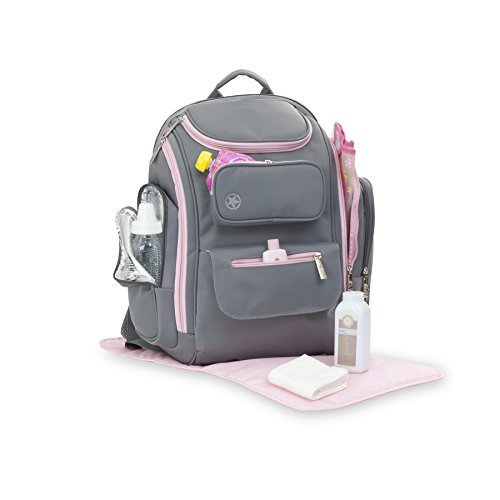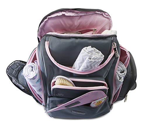 Product Description 12 pockets Stroller loops Insulated bottle pocket Easy access, pop open hard wipes case Padded shoulder straps and back comfort panel 0
