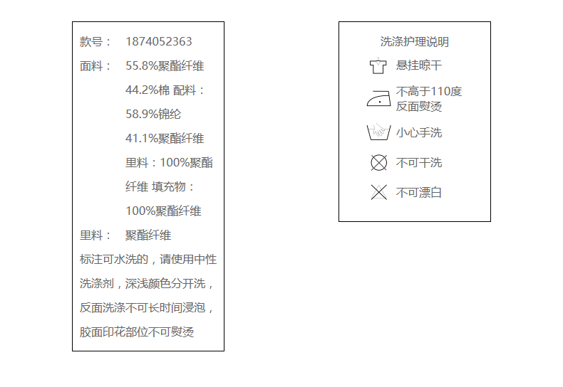 55.8%聚酯纤维 44.2%棉 配料:58.9%锦纶 41.1%聚酯纤维 里料:100%聚酯纤维 填充物:100%聚酯纤维
