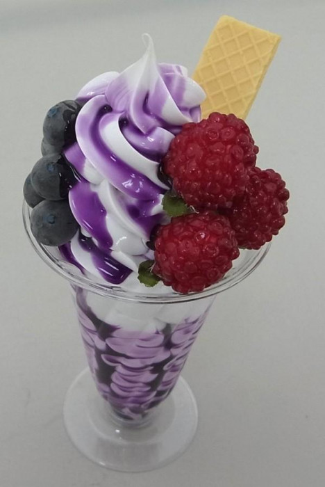 | みんな大好きなパフェを職人が食品サンプルでつくってみました。たっぷりのソースとクリームの上に、ラズベリーとブルーベリーがトッピングされたパフェです♪ |