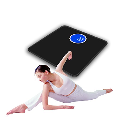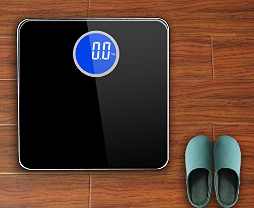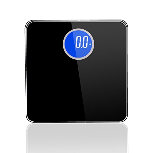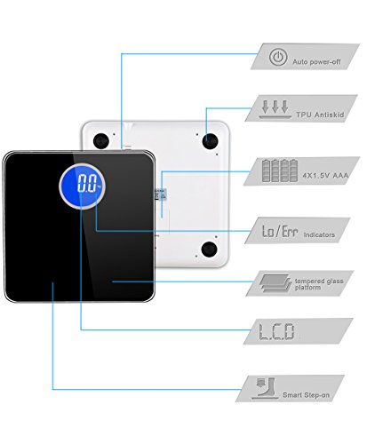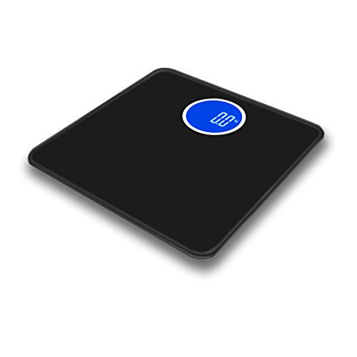 -. Feature : Smart Step-On technology - Step on the scale and turn it on instantly, get result in second. Auto Power-Off to save the battery life. / Large Bright Circular HD backlit LCD display in White/Blue, easy to read even in dark. Fashion concise style, two colors selectable. / Safety and comfort - 6mm thick tempered glass provides exceptional sturdiness; Large 11" x 11" platform for your usability / Measurement Range:11lb-400lb(5kg-180kg), Graduation increments of 0.2 lb./0.1 kg. Measure units are available in lb., kg and st. / Powered by 4xAAA batteries (samples included). 100% Satisfaction Guaranteed.