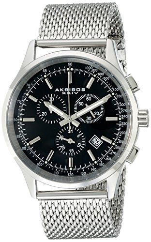 -. Binding : Watch -. Brand : Akribos XXIV -. Color : black, matte,silver-tone -. Department : mens -. EAN : 0848572021449 -. Feature : Round watch with date window between four and five o'clock and luminous hands and hour dots / 60-second and 30-minute chronograph subdials and tachymeter around outer rim / 42 mm stainless steel case with mineral dial window / Swiss quartz movement with analog display / Silver-tone mesh band with jewelry-clasp closure / Water resistant to 50 m (165 ft): In general, suitable for short periods of recreational swimming, but not diving or snorkeling -. IsAdultProduct : 0 -. IsAutographed : 0 -. IsMemorabilia : 0 -. Label : Akribos XXIV -. Manufacturer : Akribos XXIV -. Model : AK625SSB -. MPN : AK625SSB -. PackageQuantity : 1 -. PartNumber : AK625SSB -. ProductGroup : Watch -. ProductTypeName : WATCH -. Publisher : Akribos XXIV -. ReleaseDate : 2013-09-25 -. Studio : Akribos XXIV -. Title : Akribos XXIV Men's AK625SSB "Ultimate" Stainless Steel Watch -. UPC : 848572021449