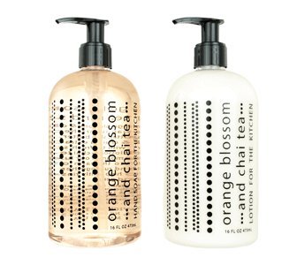 - ORANGE BLOSSOM AND CHAI TEA hand soap, enriched with shea butter, cocoa butter, thyme leaf oil, chai tea extracts and orange, grapefruit & lemon extracts; 16 ounce bottle