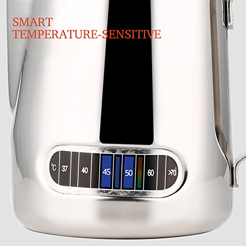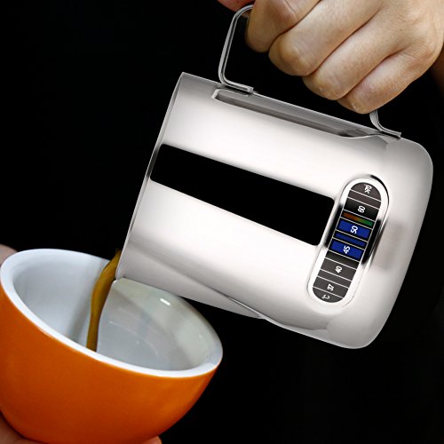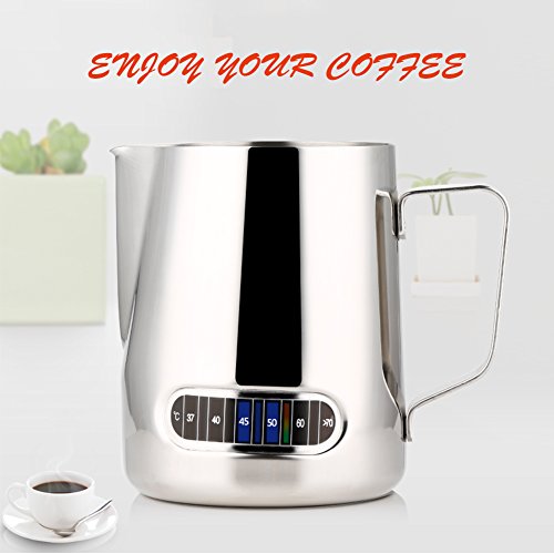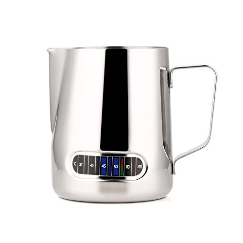 Product Description Description: This pitcher has a built-in thermometer, Thermo-Indicator, on the side of the jug that indicates the temperature with a colour coded system. When the temperature of the milk reaches the number on the thermo-indicator, the light will naturally rise.This is designed to ensure that you achieve the optimum milk temperature every time.