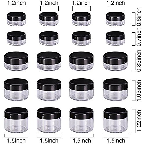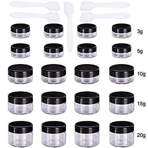 - PACKAGE INCLUDES: Including 20Pcs clear cosmetic containers and 5 Pieces Mini Spatula. The container have 5 different volume with 3 gram, 5 gram, 10 gram, 15 gram, 20 gram, each size has 4 pieces, convenience for different use