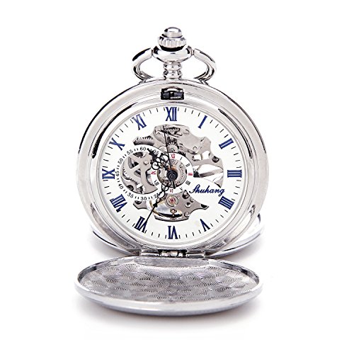 -. Title : SHUHANG Silver Double Hunter Roman Number Dial Wind Up Mens Mechanical Pocket Watch Steampunk Watch w/Chain