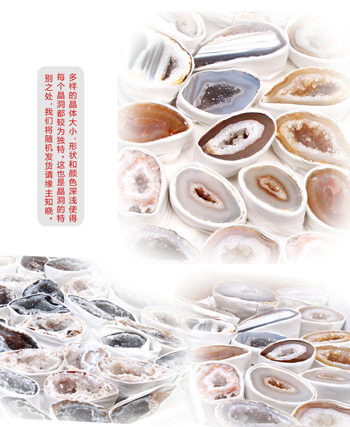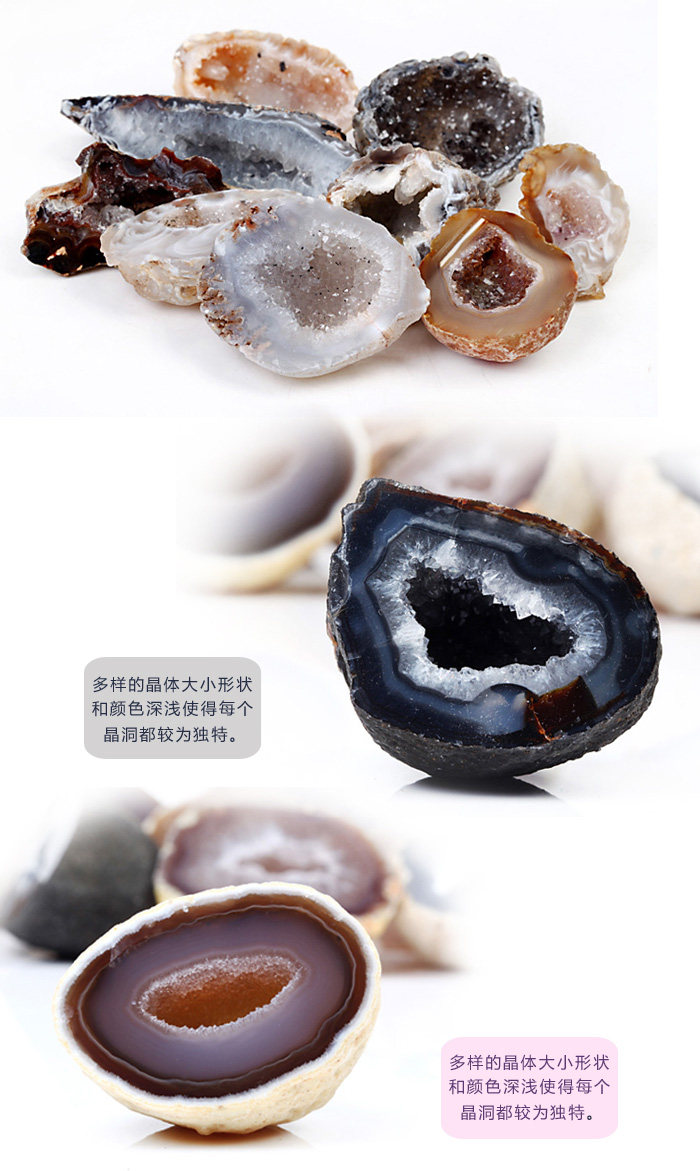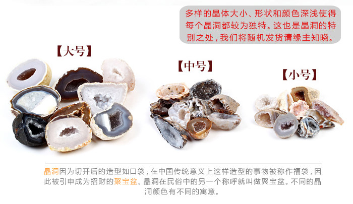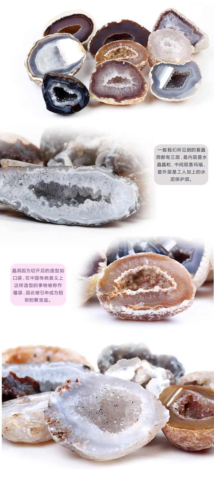 Crystal Cave, such as pocket shape after incision in the shape of Chinese traditional sense such things is called Lucky, Lucky therefore be extended to become a cornucopia. Another folk geode in the title is called Cornucopia. Geode different colors have different meaning.
