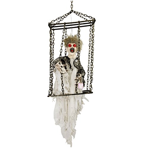 -. Feature : Hang this evil screaming ghoul in a doorway, tree or graveyard to scare off all intruders / The 20" cage contains the ghoul as it's eerie laugh, shaking arms and flashing red lights make your guests scream in fright / This sound activated prop will be a hit to any party or Halloween gathering / Dimensions: 45" Overall Height (20" Tall x 13 1/2" Wide Cage; Powered with 3 - AA Batteries (not included)
