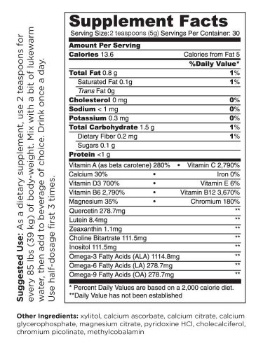 - Feature : Unique blend designed to boost attention & focus in matter of days / Drug free; Caffeine free; Sugar free; Vegetarian; OK Kosher / Super concentrated high impact formula / Every 10 grams contains: Vitamin A 2500 IU; Vitamin C 3000 mg; Vitamin D3 5000 IU; Omega 3-6-9 3000 mg; Calcium 500 mg; Magnesium 250 mg; Vitamin B6 100 mg; Vitamin B12 400 mcg / Plus: Quercetin 400 mg; Lutein 12 mg; Zeaxanthin 2 mg; Choline Bitartrate 140 mg & Inositol 140 mg