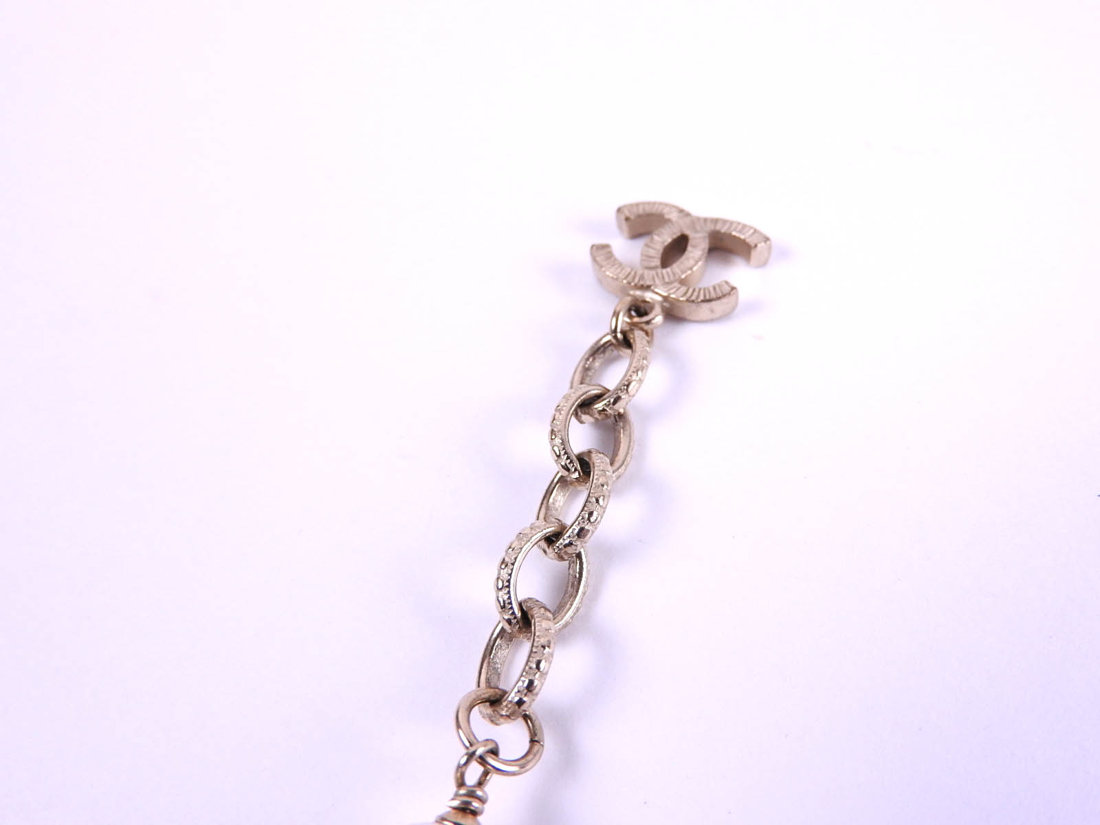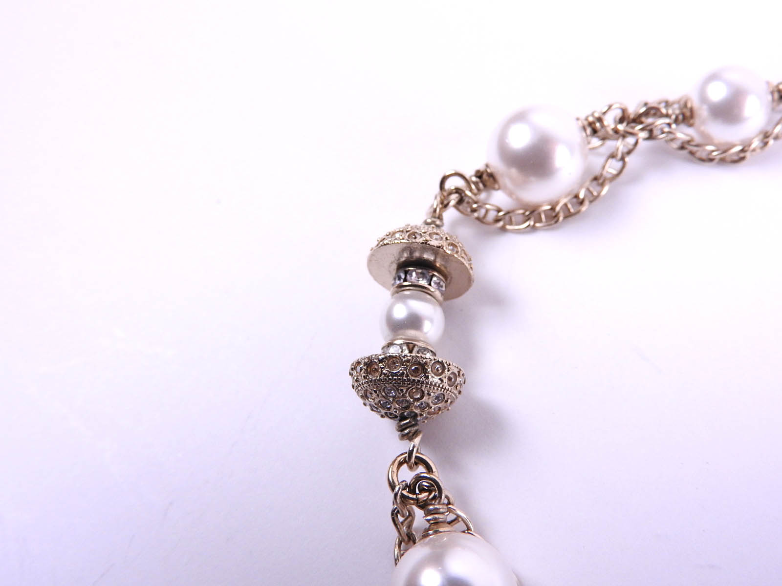 Chain: Barely used feeling. Good condition. Faux pearl: Barely used feeling. Tiny scratches. Rhinestone: Barely used feeling. Good condition. |