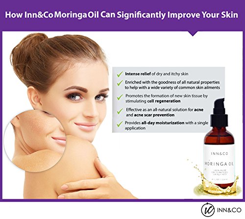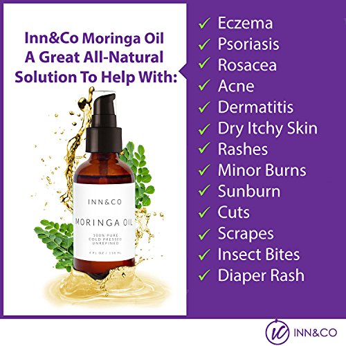 MOISTURIZES DRY SKIN - Applying Moringa Oil Directly On Your Skin Can Help Unlock It's Moisturizing And Emollient Properties, Which Can Help Skin Retain It's Moisture And Prevent It From Damage. Moringa Oil Can Also Be Applied To Your Scalp And Your Hair To Help Relieve Dandruff And Dry Hair. Report incorrect product information Frequently bought together Inn&Co Highest Quality Organic Moringa Oil - 4 fl Oz - 100% Pure, Undiluted, Cold Pressed, And Unrefined 365 Day Guarantee + 1 lb. Premium