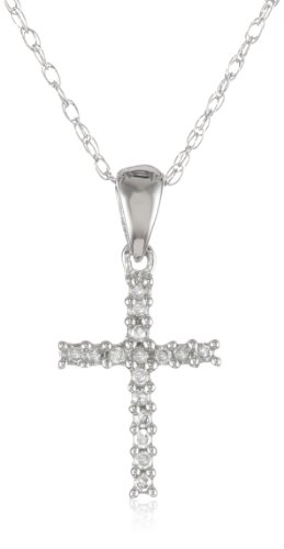 The elegant 10k White Gold Cross Diamond Pendant is an ideal choice for reflecting your faith with cultured fashion. A 10k white gold setting imparts the pendant with a sense of gleaming authority in a quality construction. Laced throughout the body of the cross, 16 natural, round-shaped, white diamonds in four-prong settings unleash a glistening spectacle of dignified resonance. Included is an 18-inch rope chain with a spring-ring clasp for added security. Equally rich in contents and spiritual representation, the tasteful cross pendant is as at home with church services as it is with your everyday endeavors.Feature