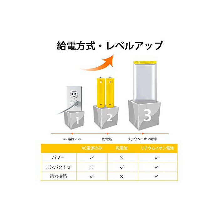 「3way급전」:전분량을 신경쓰지 않고AC전원과 usb전원에 쓸만합니다,충전해 무선에서도 OK.강력과 콤팩트이다를 이1대로 실현 합니다.