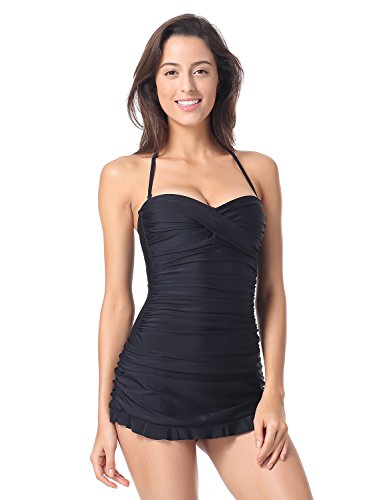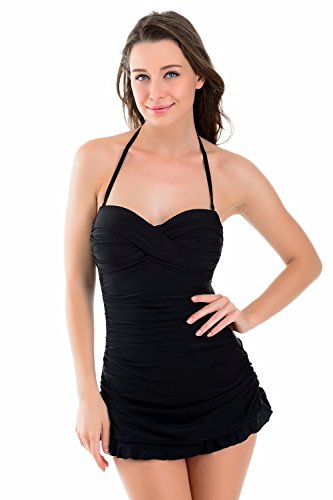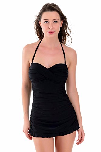 La Isla Women's One Piece Bandeau Halter Slim Bathing Dress Swimdress with Skirt Black US 12