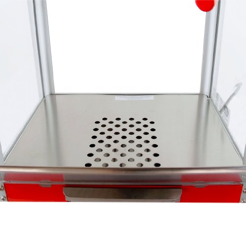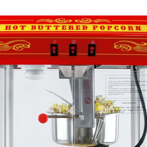 -. Feature : 860-watt carnival-style tabletop popcorn popper with 8-ounce stainless-steel flip-lid kettle / Stirring system for even heating; built-in heat lamp; pullout tray catches unpopped kernels / Metal and tempered-glass construction; simple on/off control switches / Includes measuring cup, scoop, seasoning shaker, and instructions; hand-wash / Measures 17-3/4 by 20-5/8 by 25 inches; 1-year limited warranty