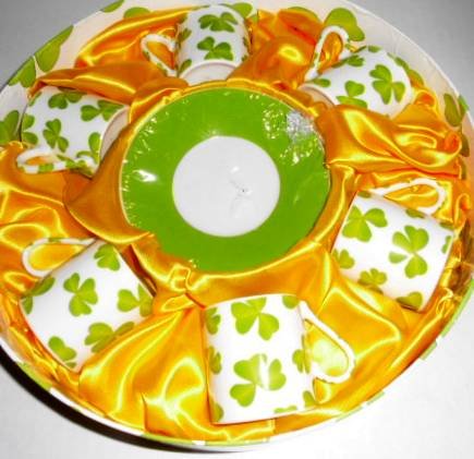 -. Feature : 6 china cups, 2" tall / 6 china saucers, 4.25" across / Clover leaf motif