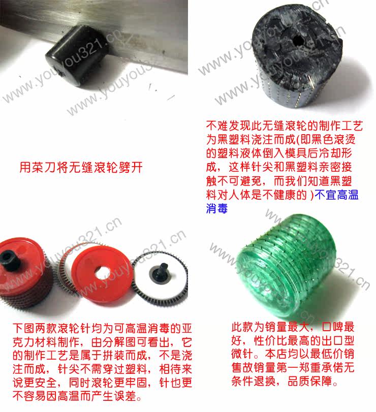 The first 1 pick micro needle to make clear plastic parts of the micro needlecan withstand high temperature sterilization, 2 see roller, the needle is putout from the roller in plastic, so on the roller, good plastic does not because the needle through and broken phenomenon or white trace of damage, theroller is poor the white phenomenon. So the roller plastic on the left needle isdamaged, workmanship is not fine, with plastic brittle, Gu can not afford thehigh temperature disinfection. 3 see the handle, the handle and flat broke,good plastic can withstand high temperatures, thick how discount has been.As shown in Fig.