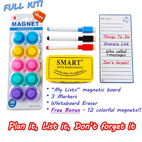 A FULL OPTIMIZED PRACTICAL ECO FRIENDLY KIT WITH BONUS INCLUDED Spacious family organizer, week numbers can be added. “My Lists” is perfect as magnetic to do list, Shopping/Grocery list, “Do Not Forget” list and notes to family members. All that you need is inside the kit – monthly magnetic calendar, magnetic list pad, three dry erase markers, magnetic eraser and FREE BONUS - 12 colored magnetic pins
