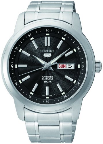 Seiko 남성용 시계.실버 스테인레스 케이스 와 실버 스테인레스 스트랩.블랙 다이얼.자동 감기 동작.양쪽으로 열림 원 푸쉬타입잠그개.방수 가공 50 미터.