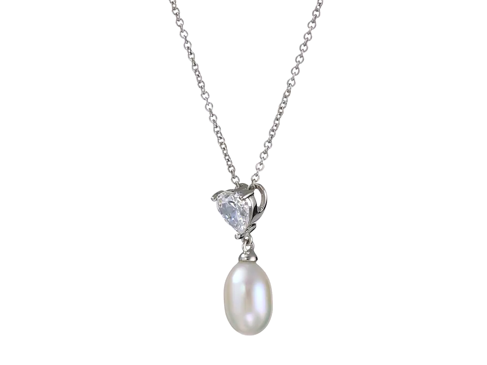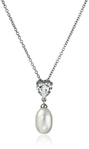 Platinum-Plated Sterling Silver Heart Cubic Zirconia with Pear Freshwater Cultured Pearl Pendant Necklace, 18"