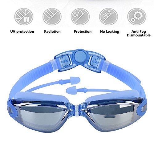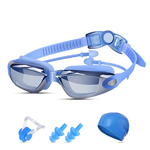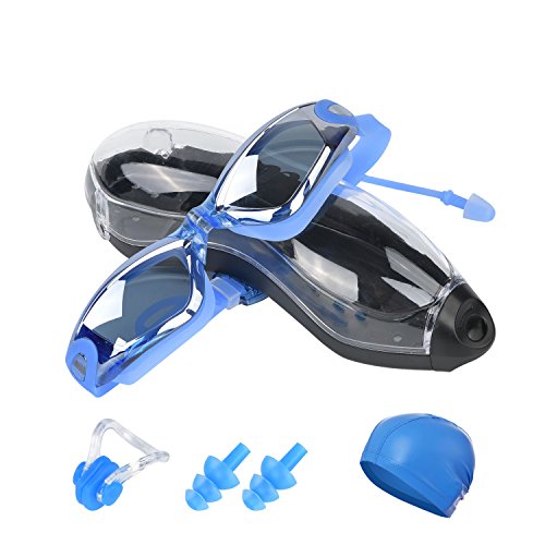 Wodelife Swimming Goggles, Anti Fog UV Protection Triathlon Swim Goggles with Ear Plugs + Swim Cap + Nose Clip Free Protection Case for Adult Men Women Unisex Youth Kids
