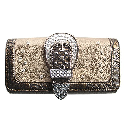 -. Binding : Apparel -. Brand : Montana West -. Department : womens -. Feature : Montana West Western Buckle Collection Wallet in 3 Colors / Rhinestones and silver embellishments. Single removeable strap to convert the wallet into a wristlet. / A zippered pocket on the back. Pocket on the inside for ID,credit cards,cash and more. / Size: 7.5 x 1 x 4. -. Model : mw 002 -. ProductGroup : Apparel -. ProductTypeName : ACCESSORY -. Size : Medium -. Title : Montana West Western Buckle Collection Wallet in 3 Colors