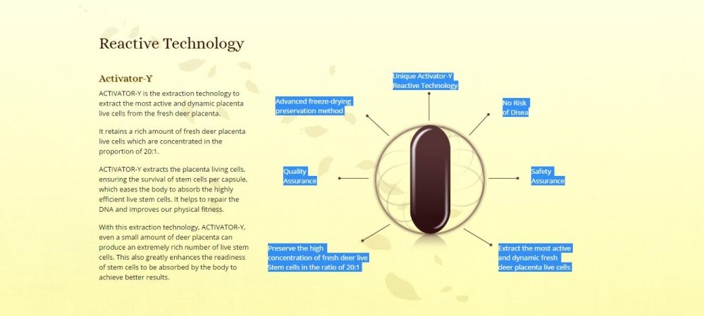 Human cannot resist the aging process, but you actually may reclaim a long-lasting youthful vigour! A research which is done by experts has showed that deer placenta has excellent biocompatibility without any allergic reactions in human. AMARANTHINE uses the new exclusive Activator-Y reactive technology to extract the most active and most energetic live stem cells from fresh deer placenta. The advanced Activator-Y Reactive Technology can inhibit the formation of aging factor, and regulate endocrine functions.