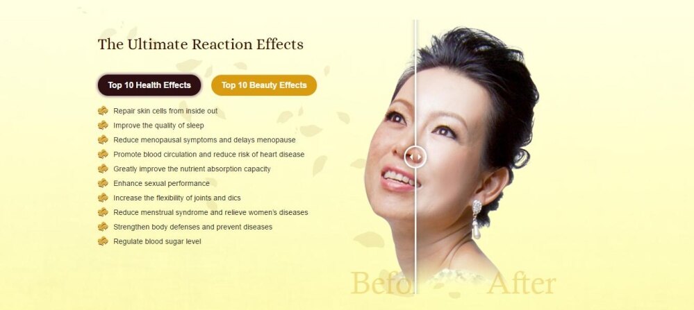 At the same time it can improve and prevent the conditions such as mottled skin, pigmentation, white hair problems, gloomy looks, s3xual dysfunction, sagging breasts, dry skin, loose and inelastic skin, gaunt looking face, and menopausal symptoms (dizziness, fatigue, insomnia, irritability).At the same time it can improve and prevent the conditions such as mottled skin, pigmentation, white hair problems, gloomy looks, s3xual dysfunction, sagging breasts, dry skin, loose and inelastic skin, gaunt looking face, and menopausal symptoms (dizziness, fatigue, insomnia, irritability).