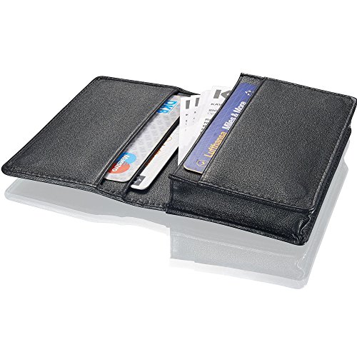 The elegant KAVAJ business card holder "Singapore" in timeless black offers you much more than a mere vehicle for your business cards: our tiny folder like all other KAVAJ products is manufactured from 100% real cowhide leather in prime quality, making it as hard-wearing and durable as it is soft and smooth to the touch. Our business card case "Singapore" can take up to 35 business cards, securely kept into places by the case's magnetic closure. An additional easy-access slot on the back stores more business cards, ID or bills. On the inside the "Singapore" business card holder offers you an extra three compartments to safely store your debit and credit cards. Its large storage capacity and extremely compact dimensions make this holder ideally suited to double as travel wallet or money purse. The premium manufacturing quality of the black coloured cowhide leather and the invisible sewn-in magnetic closure give our business card case "Singapore" a classy and stylish appearance for your professional use. We have matched this card folder both in colour and in design with other KAVAJ products in black genuine leather - making it an ideally suited match for our other products. Highlights - 100% luxurious cowhide leather in superior manufacturing quality
