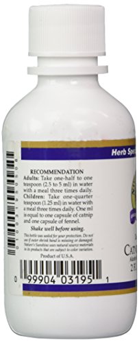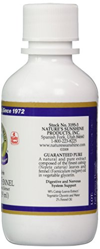 -. Binding : Health and Beauty -. Brand : Nature's Sunshine -. EAN : 0099904031951 -. Feature : Liquid formula for easy absorption and assimilation / Liquids are the ideal mode of administration for water-soluble vitamins / From the world leader in herbs and health supplements / A high quality product that meets pharmaceutical standards / Tested for consistency, quality and potency -. IsAdultProduct : 0 -. IsAutographed : 0 -. IsMemorabilia : 0 -. Label : Nature's Sunshine Products -. LegalDisclaimer : These statements have not been evaluated by the Food and Drug Administration. This product is not intended to diagnose, treat, cure, or prevent disease. -. Manufacturer : Nature's Sunshine Products -. MPN : 3195-3 -. PackageQuantity : 1 -. PartNumber : 3195-3 -. ProductGroup : Health and Beauty -. ProductTypeName : HEALTH_PERSONAL_CARE -. Publisher : Nature's Sunshine Products -. Studio : Nature's Sunshine Products -. Title : Catnip And Fennel Extract (2 FL OZ) -. UPC : 099904031951