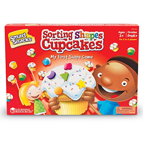 Includes 30 shape cards in 6 shapes, 4 self-checking cupcake puzzle cards, 4 pawns, large foam die, cake mix box, activity guide and game board