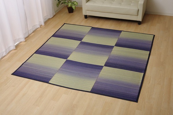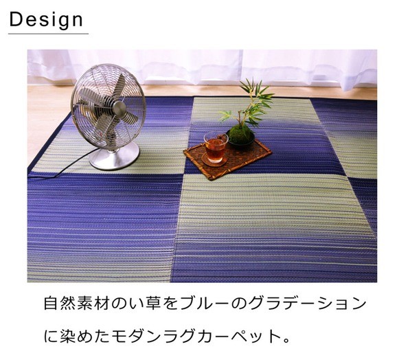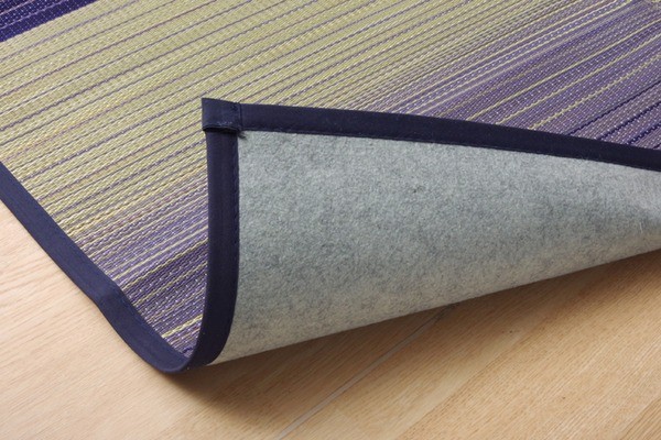 お部屋に敷きやすいカジュアルない草ラグです。裏面には滑りにくい加工をした不織布を使用しているため、フローリングにも最適です。い草には空気の自然浄化作用、湿度の調節作用などがあります。い草に青森ヒバ加工を施しています。(抗菌、防臭効果)