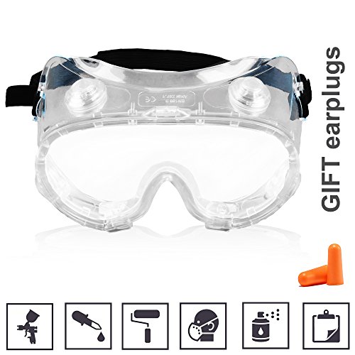 -. Feature : Painting goggles PROTECT your eyes and face from spray paint, dirt, dust, harmful chemicals, vapors and grime. / COMFORTABLY fits most users with an elastic strap & ADJUSTABLE - Тhis glasses features a vented design with easily adjusted head strap, comfortably fits and adjusts to face sizes, and also has cushioned nose bridge. / Lab goggles can be UNIVERSAL USED worn with other protective equipment including dust mask, dust coveralls, paint respirator, helmet or hard hat, and ear muffs. Also this lab goggles can be use with over glasses. / Lab goggles is durable and scratch-resistant material offers product longevity / Shields eyes from UV ultrafiolet. Safety goggles can be use indoor or outdoor.