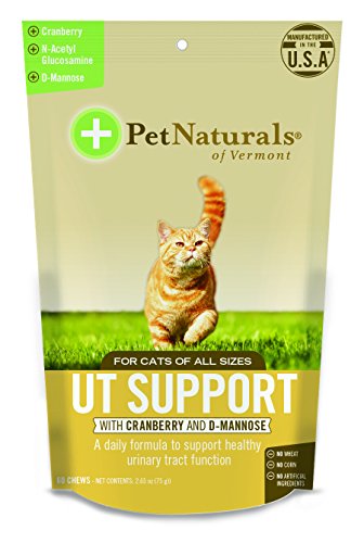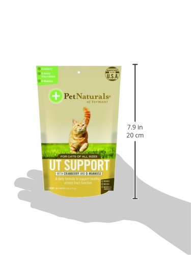 -. Binding : Misc. -. Brand : Pet Natural's Of Vermont -. EAN : 0026664005571 -. Feature : UT Support is a daily supplement that contains 4 active ingredients that promote proper urinary tract function and may reduce the likelihood of crystal formation that causes discomfort among cats / Our UT Support formula is a chicken liver flavored soft chew that even the most finicky cats will love / UT Support provides added nutrients that help maintain normal PH balance in the urine of cats that are prone to UT infections / Our UT Support supplement is veterinarian formulated and approved by our veterinary review board / All Pet Natural's of Vermont products are NASC approved and manufactured in the USA -. Label : Vetri-Science Laboratories -. Manufacturer : Vetri-Science Laboratories -. Model : 0700869.060 -. MPN : 0700869.060 -. PackageQuantity : 1 -. PartNumber : 0700869.060 -. ProductGroup : Pet Products -. ProductTypeName : PET_SUPPLIES -. Publisher : Vetri-Science Laboratories -. Studio : Vetri-Science Laboratories -. Title : Pet Natural's of Vermont 60 Count Urinary Tract Support Supplement Soft Chews for Cats -. UPC : 026664005571