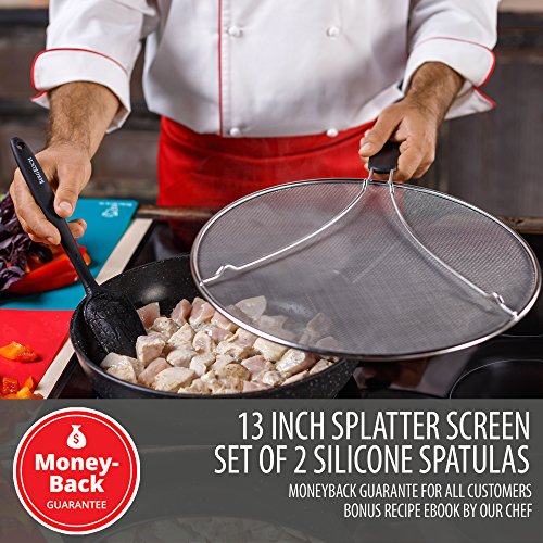 Set of best kitchen tools for a chef or cooking enthusiast: 13-inch heavy-duty splatter guard for frying pan and 2 silicone high temperature resistant spatulas. Need to replace your old flimsy plastic cookware with professional utensils? Looking for a perfect gift for one special person? You are in the right place!