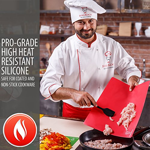 BPA-free, heat resistant, non-slip with satin finish: Measuring 11.2" and 8.8", BergKoch silicone turner and scraper are safe for coated and non-stick cookware. Being resistant to the temperatures up to 600°F, they are best for hot foods and using on the stovetop while cooking. The nice velvety texture ensures effective grip even for wet hands. MONEYBACK GUARANTEE. ADD TO CART NOW!