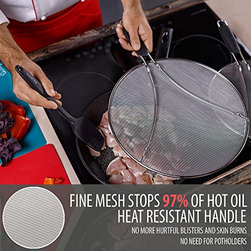 HEAVY DUTY 13-INCH SPLATTER SCREEN WITH RESTING FEET AND PLASTIC HANDLEYou enjoy bacon, but frying leaves your kitchen greasy? Tired of dirty clothes and hot oil burns on your skin?