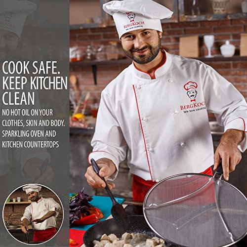 Stops 97% of splash and keeps kitchen clean: Made of 304 grade stainless steel and extra fine mesh, BergKoch splatter guard lid lets all the steam out and allows you to watch the cooking process easily. Resing feet keep grease off your counters. Securely joined plastic handle protects your hands from painful burns.