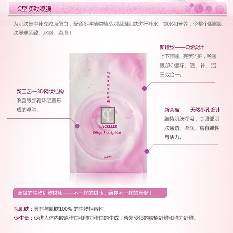 【产品说明】:突破性C型设计,照顾眼周肌肤,畅通眼部C循环,通、补、活三效合一。生物纤维材质,契合皮肤纹理,让精华液充分的深层渗透,为肌肤集中补充胶原蛋白;3D网状交错结构,改善眼部循环阻塞形成的浮肿;天然小孔设计,维持肌肤呼吸,令眼部肌肤通透、柔润、富有弹性与活力。
