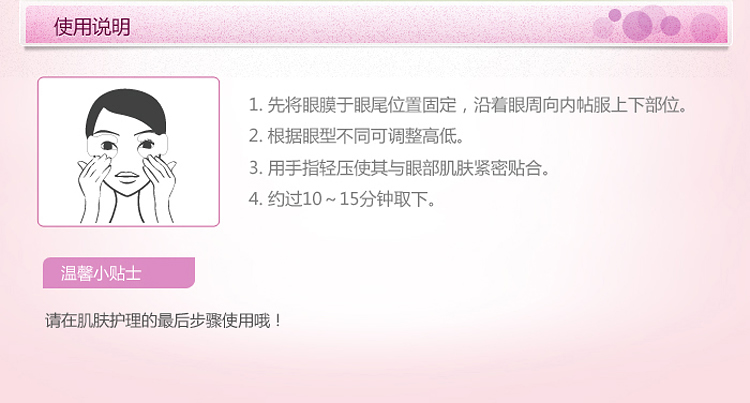 【使用方法】:先将眼膜于眼尾位置固定,沿着眼周向内帖服上下部位,根据眼型不同可调整高低,用手指轻压使其与眼部肌肤紧密贴合。约过10~15分钟取下,请在护理的最后步骤使用。眼膜总共有三层,请使用中间一层。