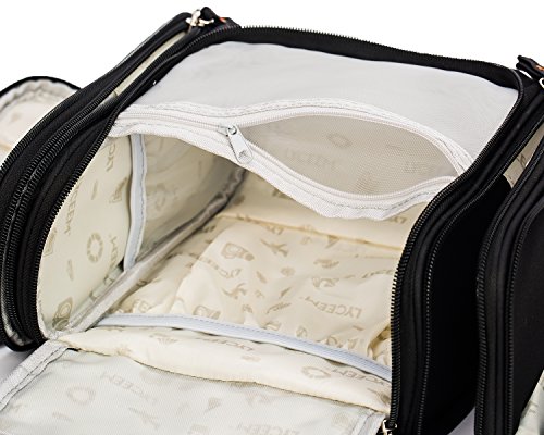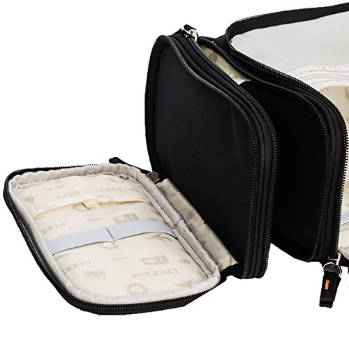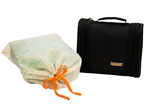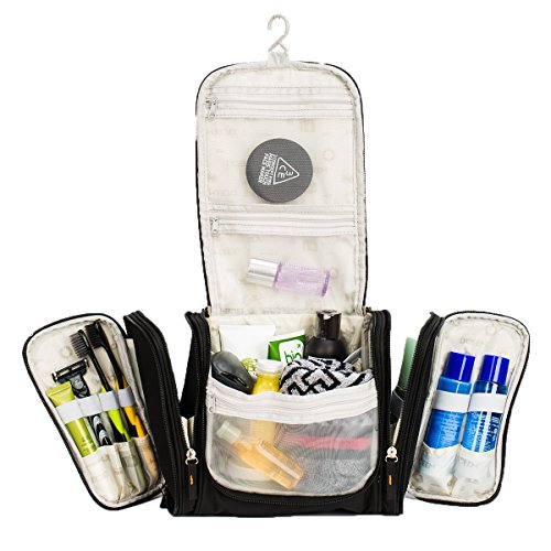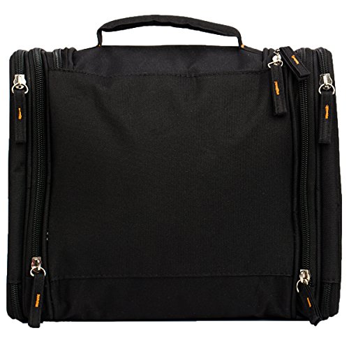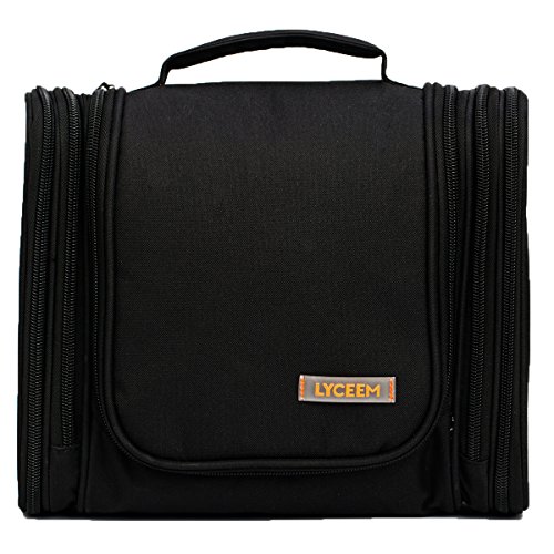 Product Description Made of durable polyester that is water-resistant fabric High Capacity:7.6L 11.3"*4.7"*8.6"(29*12*22cm) Has plenty of pockets and compartments, there should be enough room for items such as deodorant, mouthwash, a toothbrush, toothpaste, dental floss, hairbrush, combs, band-aids, shaving cream, razors, and even your phone ect Great way to separate all your personal items from clothes and sneakers when traveling Waterproof, could hanging it in the bathroom with no damage,best for family trips 0