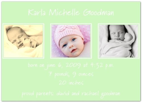 Studio : Storkie Express Publisher : Storkie Express Binding : Baby Product Product Description Birth Announcements: "Take Three on Mint" features three of your baby's photos on this simple, contemporary design. The mint green background is accented by double whit 0