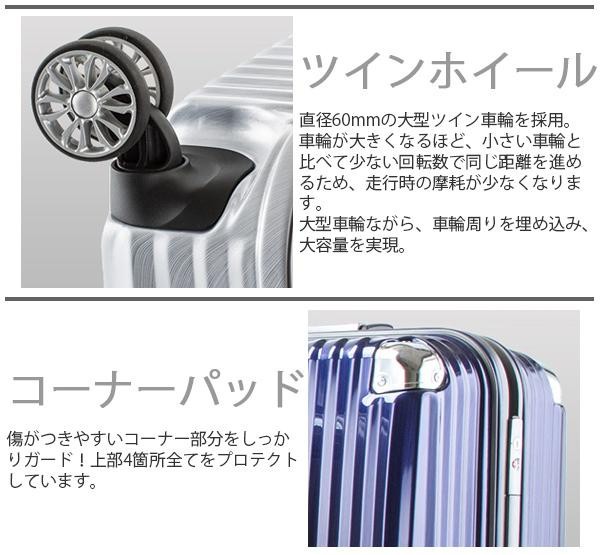 60mmの大型ツイン車輪を搭載したスーツケース。大型車輪ながら、車輪周りを埋め込むことで大容量を実現しました。シェル部分には上品で高級感のあるヘアライン加工を採用。美しさと機能性を同時に実現しました。 |