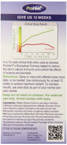 ReleaseDate : 2015-03-19 Studio : Provent Publisher : Provent Binding : Health and Beauty Product Description ProVent Eczema and Psoriasis care is a natural, organic, bioceutical, non-steroidal spray designed for sensitive skin to help minimize skin conditions often associated with Eczema and Psoriasis. This concentrated sypgeric, all natural, spray contains extracts from twenty-five different herbs, and is based on a century-old formula that originated in India. Provent Eczema and Psoriasis spray should be used twice daily for at least the first twelve weeks, then at least once daily as part of your daily skincare regimen. 0