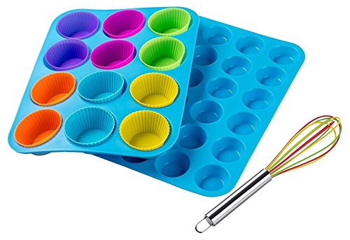 Bistrosa Muffin Pan Mini Plus Large Silicone Baking Bakeware Set with Cupscake Liners Plus Whisk, Blue