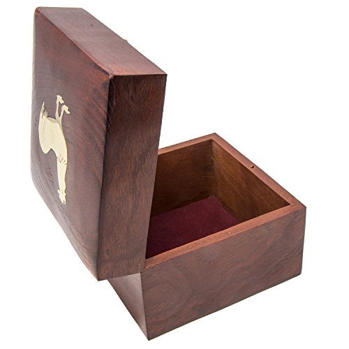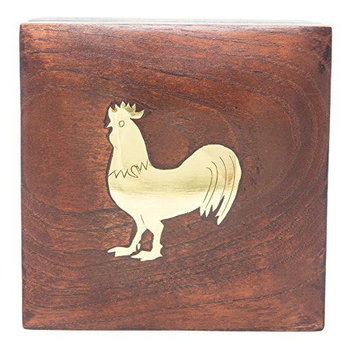 Handmade Wood Square Box Carved By Traditional Artisans Of India- Wood Box Storage-Square Wood Box For Trinkets-Rooster Charm,4.5 Inch