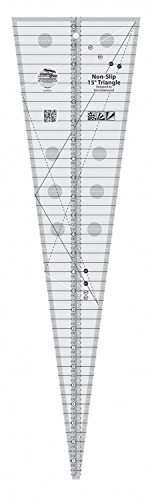 [Description] Sew together 24 of Creative Grids 15 degree triangles to create a complete circle; 12 to create a semi-circle; or 6 to create a quarter-circle. Create Fans_ Dresden Plates_ etc. up to a finished size of 48 inches with this EXCLUSIVE Quilting Template and Ruler. This quilting ruler triangle shaped_ comes with marked 1/4 inch seam allowance. 15 Degree Triangle Quilting Ruler has a PREMIUM Gripper which holds the fabric for smooth cutting. Cut 30; 45; 60; and 90 degree units with the CLEAR Angles Marked on the triangular ruler. Use the Vertical Lines to Fussy Cut Stripes or Cut Half-Triangles. Scan QR Code printed on this quilting ruler to view a video demonstration.